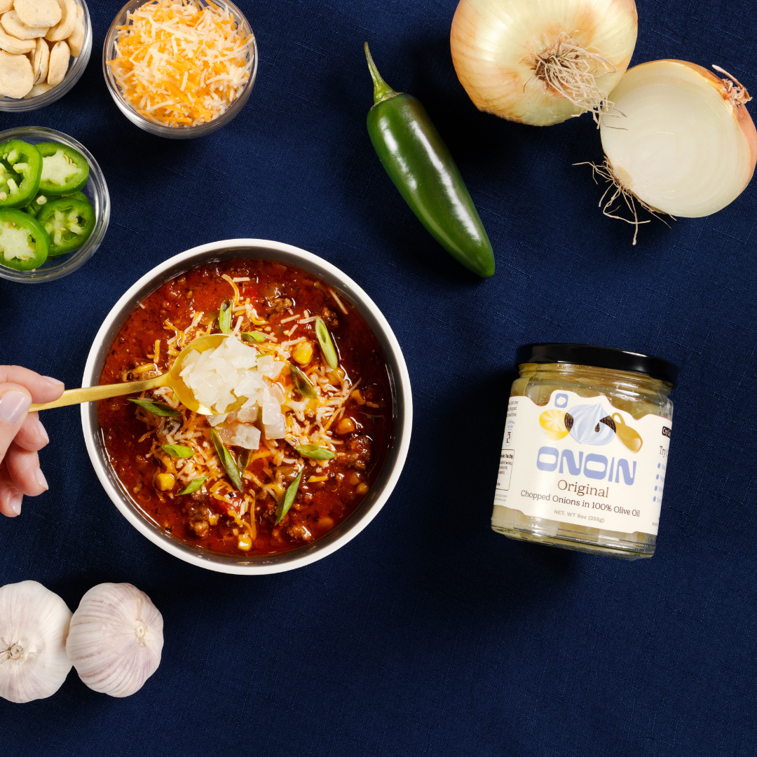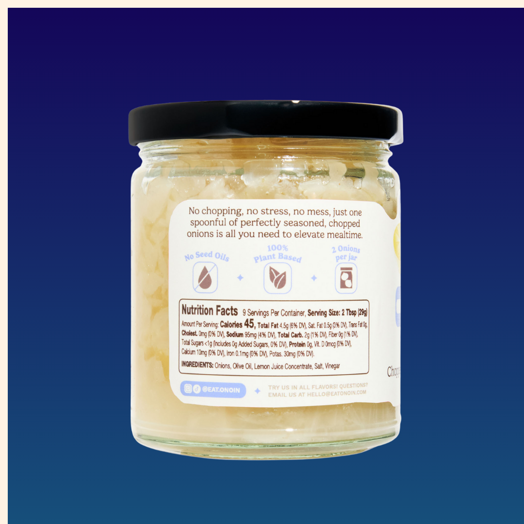 Why cry over onions when you’ve got Onoin? Our ONOIN Original blend is as simple as it gets—onions, olive oil, salt, lemon juice, and vinegar. Each jar packs the flavor of two onions without the chopping, mess, or tears. It’s shelf-stable, preservative-free, and 100% plant-based with no seed oils. Use it as the base for soups and sauces, a marinade for meats, or a topping for vegetables and fish. Tastes like you spent hours. Actually, it took seconds. Created by Marc, a food scientist and lifelong home cook who was over the nightly grind of chopping onions. ONOIN brings real flavor back to quick meals. Because dinner should taste like chef-level effort without the chef-level work—ON your plate, IN your pantry, always ready to go.