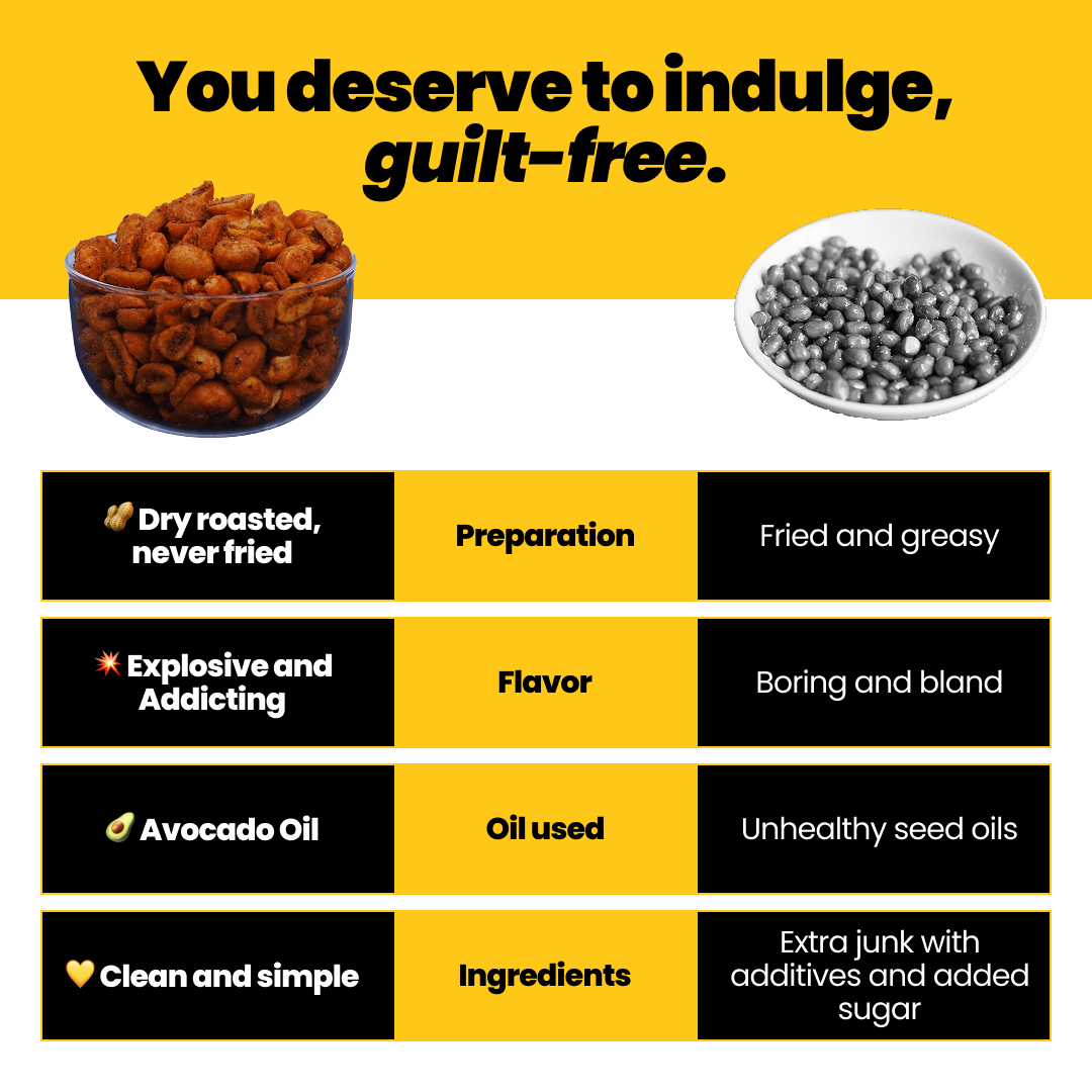 Dry Roasted Peanuts Indulge in the savory blend of our Origin Masala Dry Roasted Peanuts. These nuts are dry-roasted to crunchy perfection and seasoned with Chaat Masala, the magical dust of Indian street food. We make a fresh house-blend of Chaat Masala to deliver a rich umami taste that'll have your lips smacking with deliciousness. In Hindi, Chaat Masala translates to "to lick the spice", and trust us, once you taste it, you'll find yourself licking the bottom of our snack bags, which is fully acceptable.